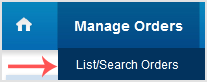 2. After a successful login, click on List/Search Orders from the Manage Orders drop-down menu.