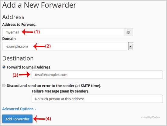 Step 3: On the Add a New Forwarder page, you will see the Address to forward: field. If you want to forward your [email protected] to your custom e-mail address, enter my-email in the Address to forward, field and should you have multiple domains, select the appropriate one from the domain drop-down list.