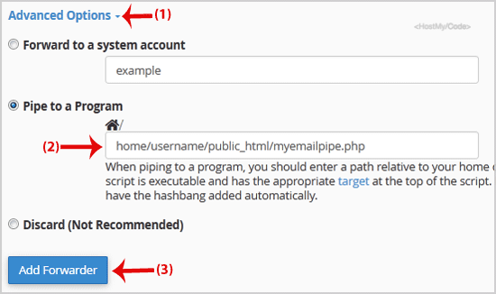 1. If you want to forward your email to an e-mail pipe script like myemailpipe.php, which is located on your public HTML folder like /home/username/public_html/myemailpipe.php, follow Step 2 and Step 3.